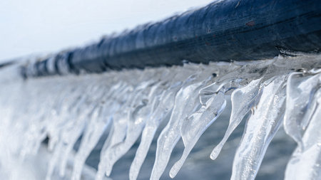 Frozen jetty at the sea with icicles hanging at the metal handrails. Shallow depth of field