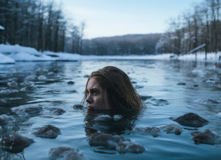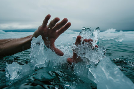 A man trying to grab onto a piece of floating ice, with his hands slipping.