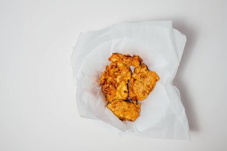 High angle of appetizing roasted chicken in batter on napkin in bowl on white background in studio