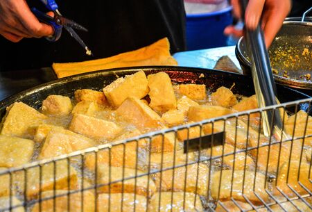 street food at night market walking street in Taipei, Taiwan - deep fried stinky tofu is a traditional famous food in Taiwan