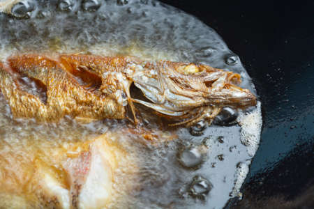 Two face-to-face fish, frying in a frying pan, boiling oil