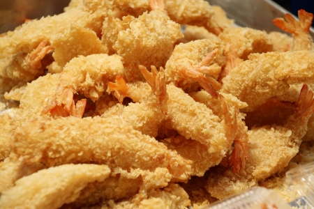 King shrimp tails cooking. Close up of Frying Shrimps in the fryer in hot oil.