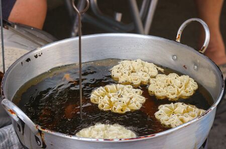 Thai traditional street snack food frying on hot oil pan.
