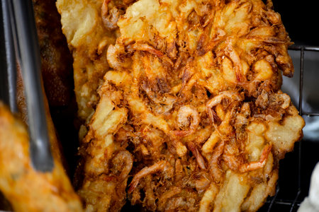 Delicious morsels are frying to a perfect golden brown at a lively street food stall.
