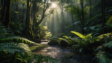 A beautiful shot of sunbeams filtering through a dense jungle canopy, lighting a small stream. Lush green foliage and moss-covered rocks surround the tranquil watercourse in a peaceful setting.