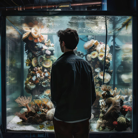 A visitor stands in front of a large aquarium filled with vibrant coral formations and marine life. The dimly lit environment enhances the beauty of the underwater ecosystem. The individual appears captivated, exploring the diverse colors and shapes of the coral.