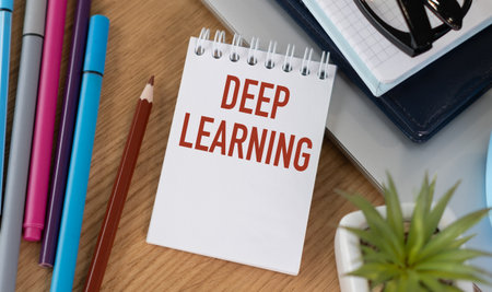 Deep Learning text on notepad with colored pencils on office desk
