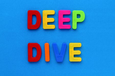Text made in multicolored magnetic letters. DEEP DIVE. Blue background
