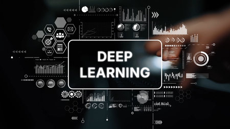 Futuristic Interface with Deep Learning Text Surrounded by Data Visualizations and Graphs on a Dark Background. Asymptotic smart data analytic.