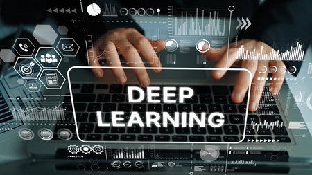Hands Typing on Laptop with Deep Learning Concept Overlay and Data Visualization Elements in Modern Workspace. Asymptotic smart data analytic.
