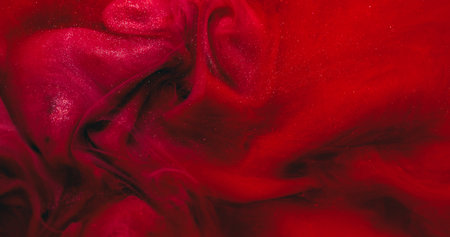 Wet sparkling texture. Shimmering particles acrylic. Paint flowing ink. Defocused red black color water marble blend wave abstract art background.