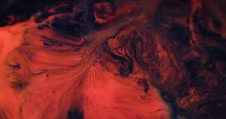 Acrylic color drip. Paint fluid mix. Defocused red black pigment powder grain particles water dye ink emulsion liquid flow abstract art background.