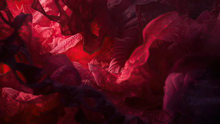 A striking abstract texture with heavy, dark brushstrokes contrasted by a strong red light. The image showcases rough texture and dramatic lighting for an artistic background.