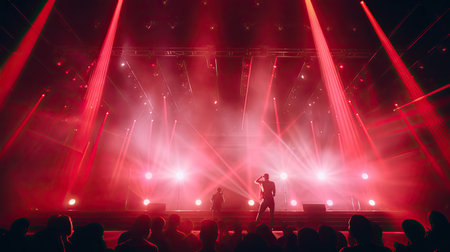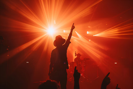 A dynamic silhouette of a performer wearing a hat, pointing upward on stage under intense red lighting, creating a dramatic concert atmosphere, International Music Day.