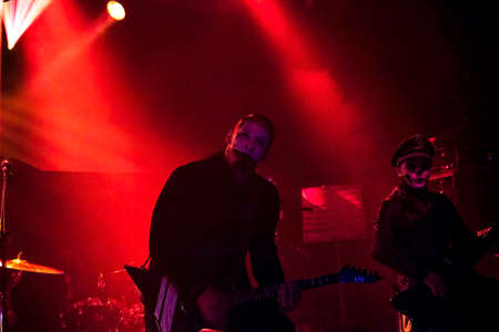 Krakow, Poland - September 20, 2014: An artist in disguise playing guitar in a hardcore western rock band music concert performance.
