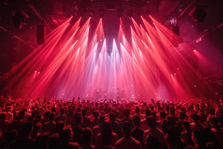Bright red lights shine down on a crowd during a live music performance, creating a lively and energetic concert scene at night.