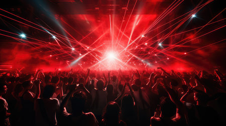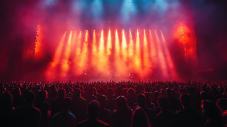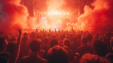 A crowded concert hall with scene stage lights, live show performance, with people silhouette, dance floor during a concert open-air festival