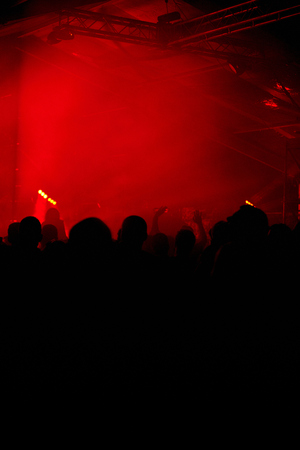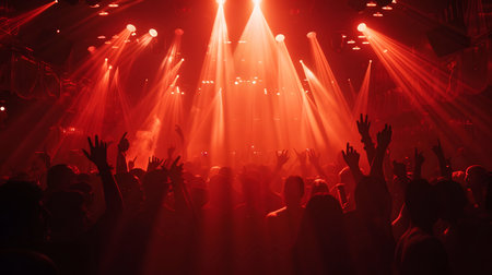 party concert photo, one hand raised in air, red light coming from stage. dark atmosphere, unrecognizable people.