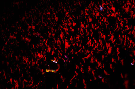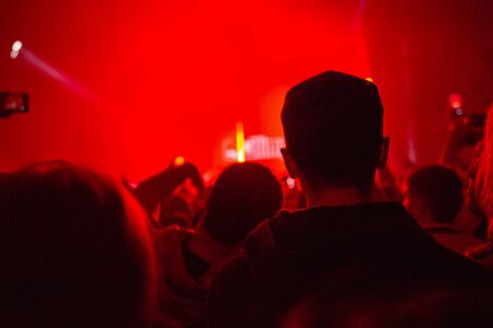 A crowd of people at the concert have fun and dance to the music at the concert. Red light in the background. Rear view. The concept of entertainment and relaxation.