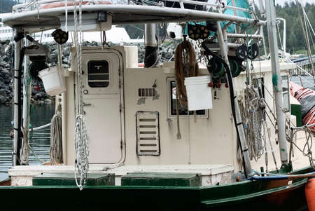 Fishing vessel underway in Alaskan waters, equipped with fishing nets and buoys, ready for commercial fishing operations