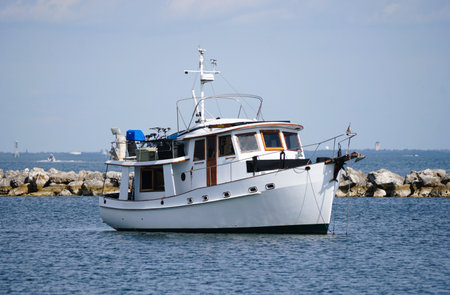 St Petersburg, Florida, U.S.A - Jan 2, 2026 - A traditional white trawler boat with wood accents sits anchored in calm water beside a rocky breakwater