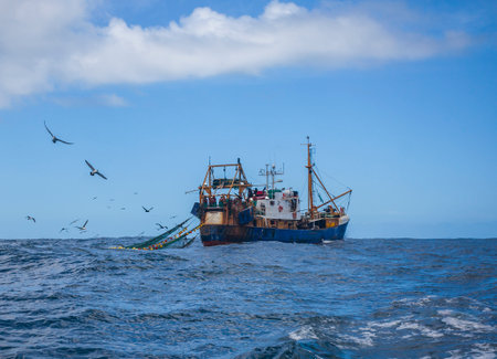 Large fishing vessel hauls trawling gear in the Atlantic waters. Fishing trawler is engaged in catching sea fish and seafood in ocean waters.