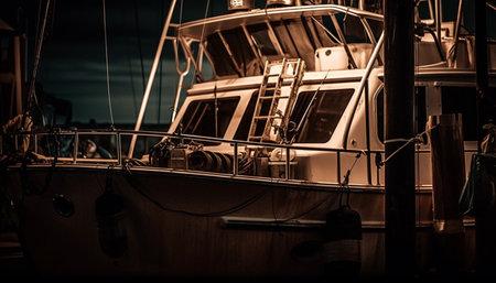 Sailing yacht moored at commercial dock, reflecting steel and wood generated by artificial intelligence