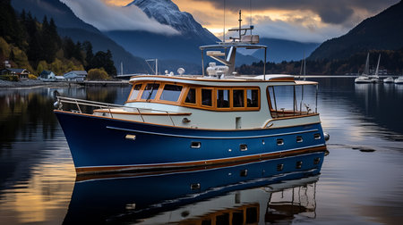 The blue motorboat floats serenely in the still water, reflecting surrounding mountains at sunset, creating a peaceful atmosphere in a secluded bay.
