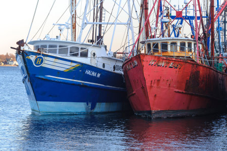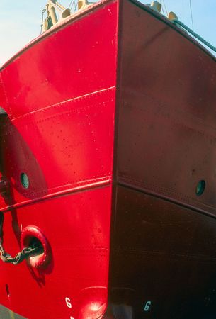 Fairhaven, Massachusetts, USA - June 9, 2019: Sunlight reflecting off bow of commercial fishing vessel Luzitano