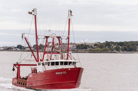 New Bedford, Massachusetts, USA - December 21, 2017: Lobster boat leaving port on the Acushnet River
