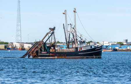 New Bedford, Massachusetts, USA - June 24, 2018: Commercial fishing vessel Miss Georgia, hailing port Aurora, North Carolina, crossing New Bedford harbor