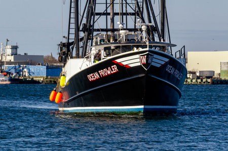 Fairhaven, Massachusetts, USA - March 22, 2020: Scalloper Ocean Prowler, hailing port Cape May, NJ, getting ready to dock after fishing trip