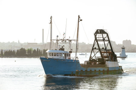 New Bedford, Massachusetts, USA - May 29, 2018: Clammer Starlight leaving New Bedford on a hazy evening