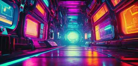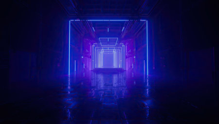 3D rendering of a futuristic corridor with neon lights in the background