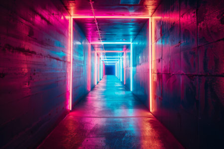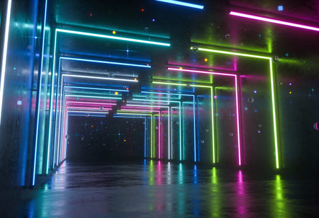 Neon-lit tunnel illuminated lights in dimly lit room creates abstract geometric grid colorful rays