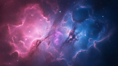A stunning cosmic landscape featuring vibrant pink and blue nebulae among a star-filled dark sky, illustrating the beauty and vastness of the universe.