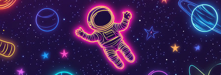 A vibrant astronaut poses in a futuristic space setting, showcasing a radiant play of colors and an imaginative atmosphere perfect for creative projects.