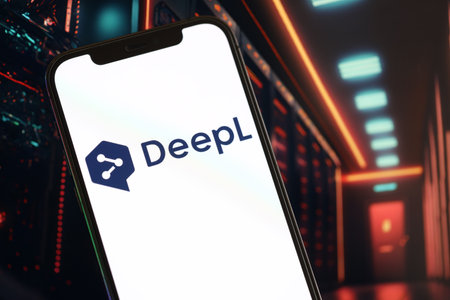 KYIV, UKRAINE - MARCH 17, 2024 DeepL logo on iPhone display screen with background of artificial intelligence futuristic ai generated image close up