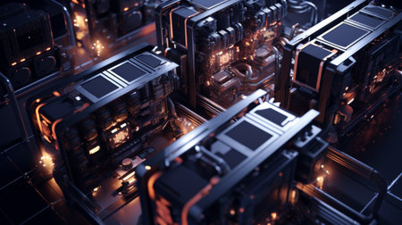 A detailed view of a futuristic circuit board showcasing intricate patterns and components in black, with glowing orange and gold accents, perfect for technology themes.