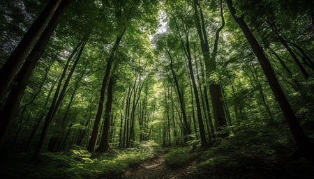 Tranquil scene of a vibrant forest with a mysterious wilderness generated by artificial intelligence