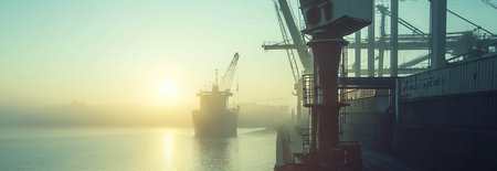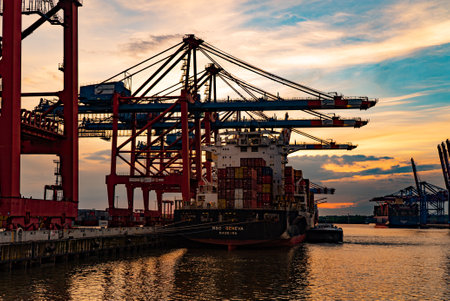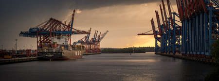 Industrial port with cranes and ships at sunset, Hamburg, Germany