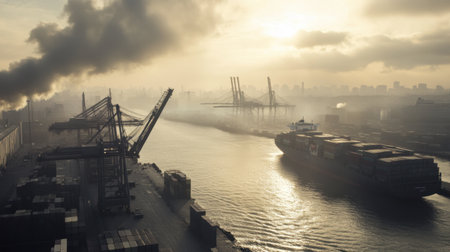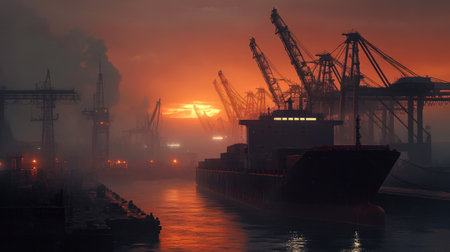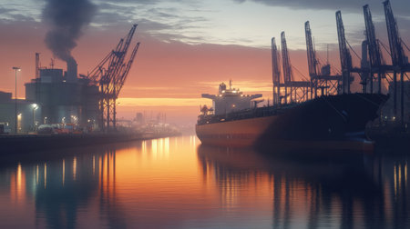 Twilight at an industrial port, featuring a container ship docked and cranes working in the background. The dimming light creates a moody atmosphere.