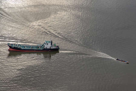 Koblenz, Germany - May 23, 2019. A large tanker ship sailing in Germany on the Rhine River. Transportation of oil, gas and gasoline.