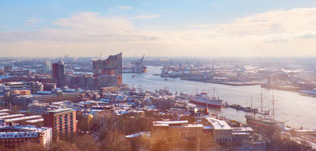 Scenic panorama view from Dancing Towers over Hamburg under snow in winter with Speicherstadt, harbor warehouses and New Elbe Philharmonic Theater, Elbphilharmony.
