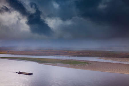 Air photography of push tug moving with barge on calm river in cloudy autumn day. Snow running from the low cumulus clouds.