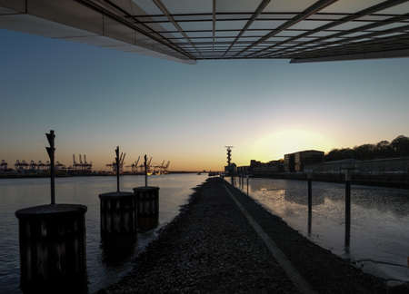 Hamburg harbor scenery at dusk. View from the office building Dockland downstream towards the Burchardkai Container Terminal