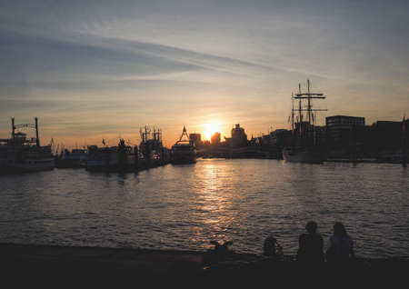Aerial view of the Elbe River and ships in the city of Hamburg during sunset. Geramania in the summer.