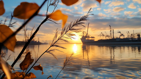 A tranquil sunset over a harbor, with golden autumn leaves and delicate reeds in the foreground, framing the industrial landscape and reflecting in the calm water.