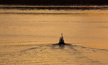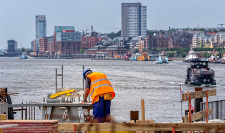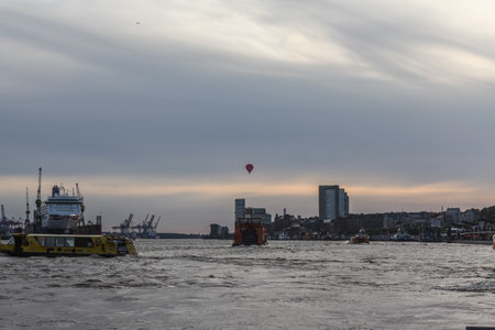 Scenic waterfront and industrial boat on the Elbe river in Hamburg, Germany