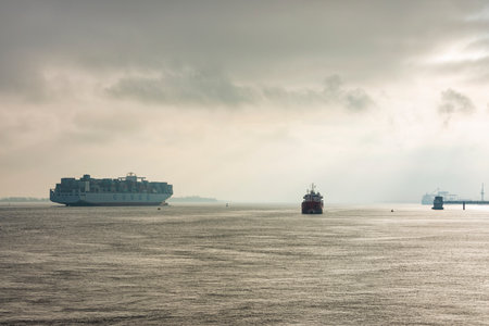 Stade, Germany - December 15, 2017: Container ship COSCO DENMARK on Elbe river heading towards Hamburg on a very foggy morning, passing a moored gas tanker